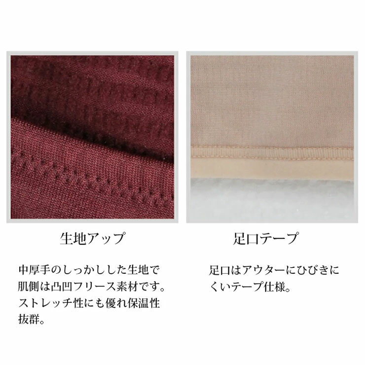 素材 身生地:ポリエステル95%、ポリウレタン5% ゴムテープ部分:ナイロン、ポリウレタン サイズ M/L/LL 特徴 この凸凹が暖かさの秘密 肌に触れる面が凸凹フリース素材で空気を含みあったか保温。